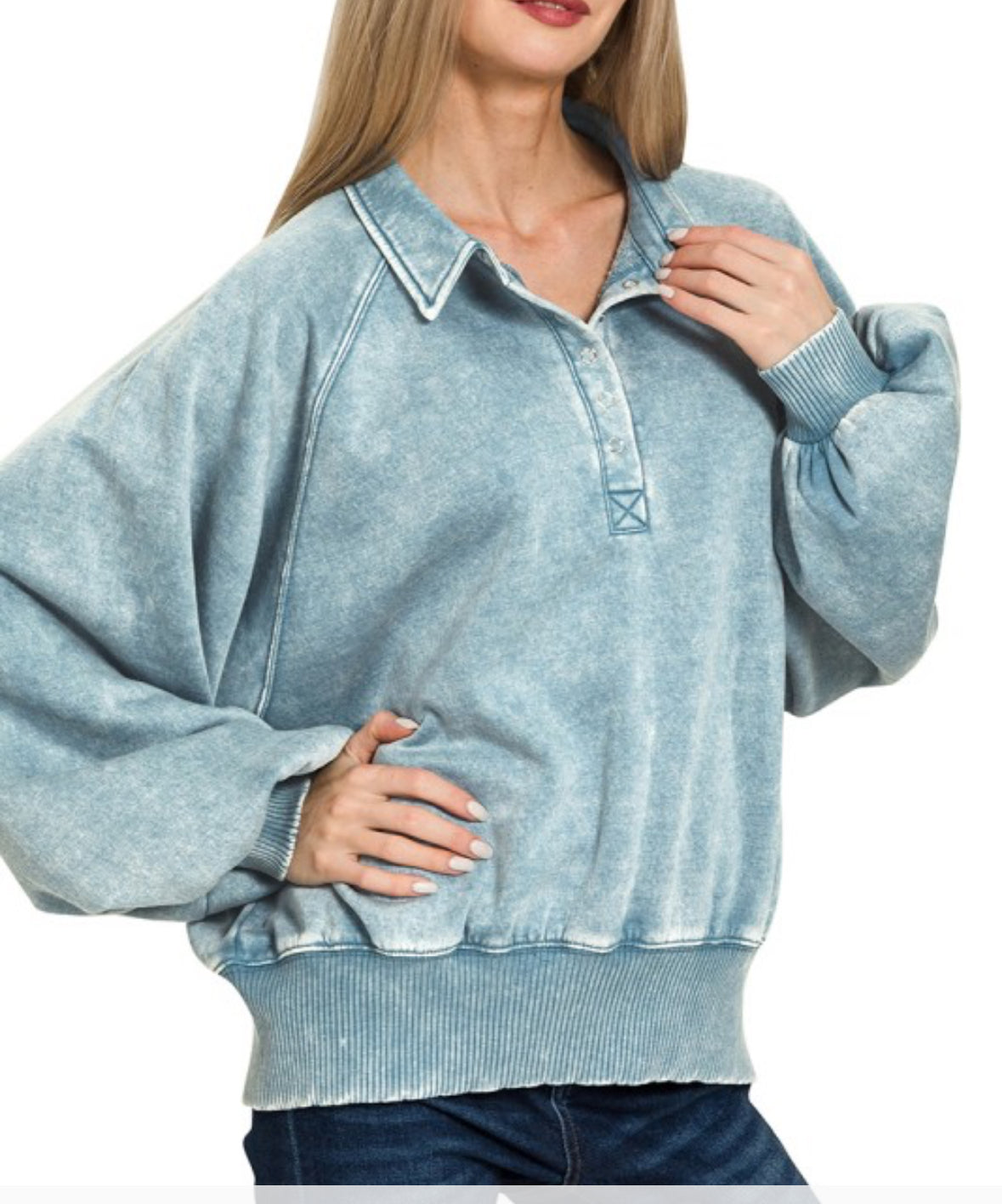 Discover the ultimate comfort and style with our Acid Wash Button Pullover in Blue. This pullover features a mineral wash design, creating a unique and trendy look. Made with soft fleece, it also includes a button-up collared neckline for a sophisticated touch. Upgrade your wardrobe and stay cozy in style.