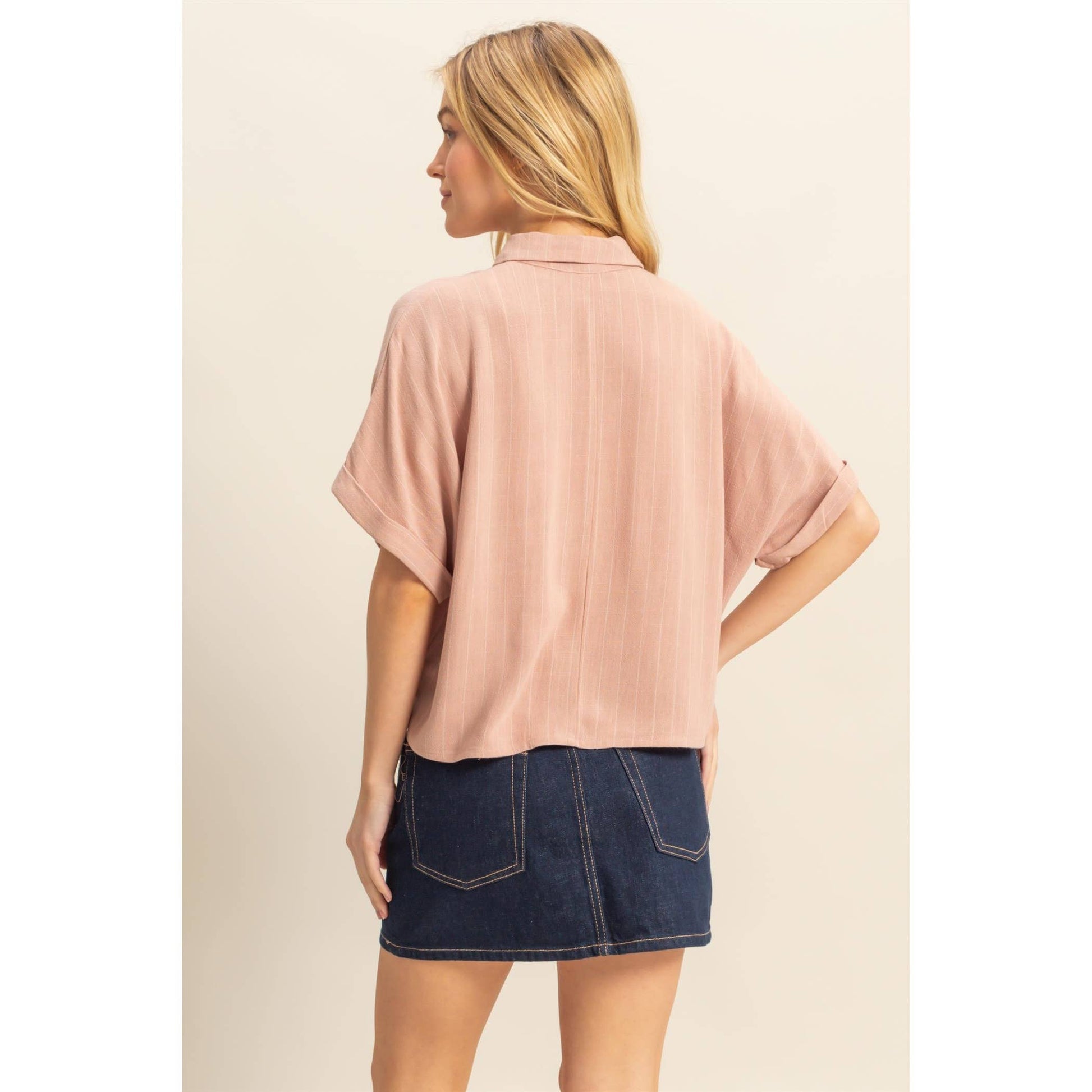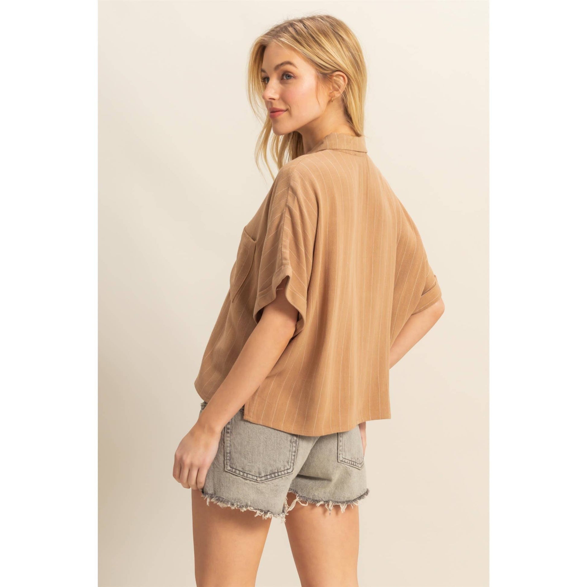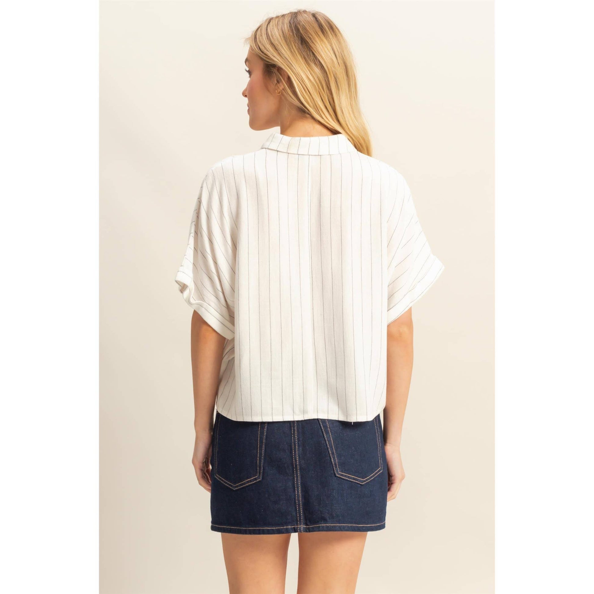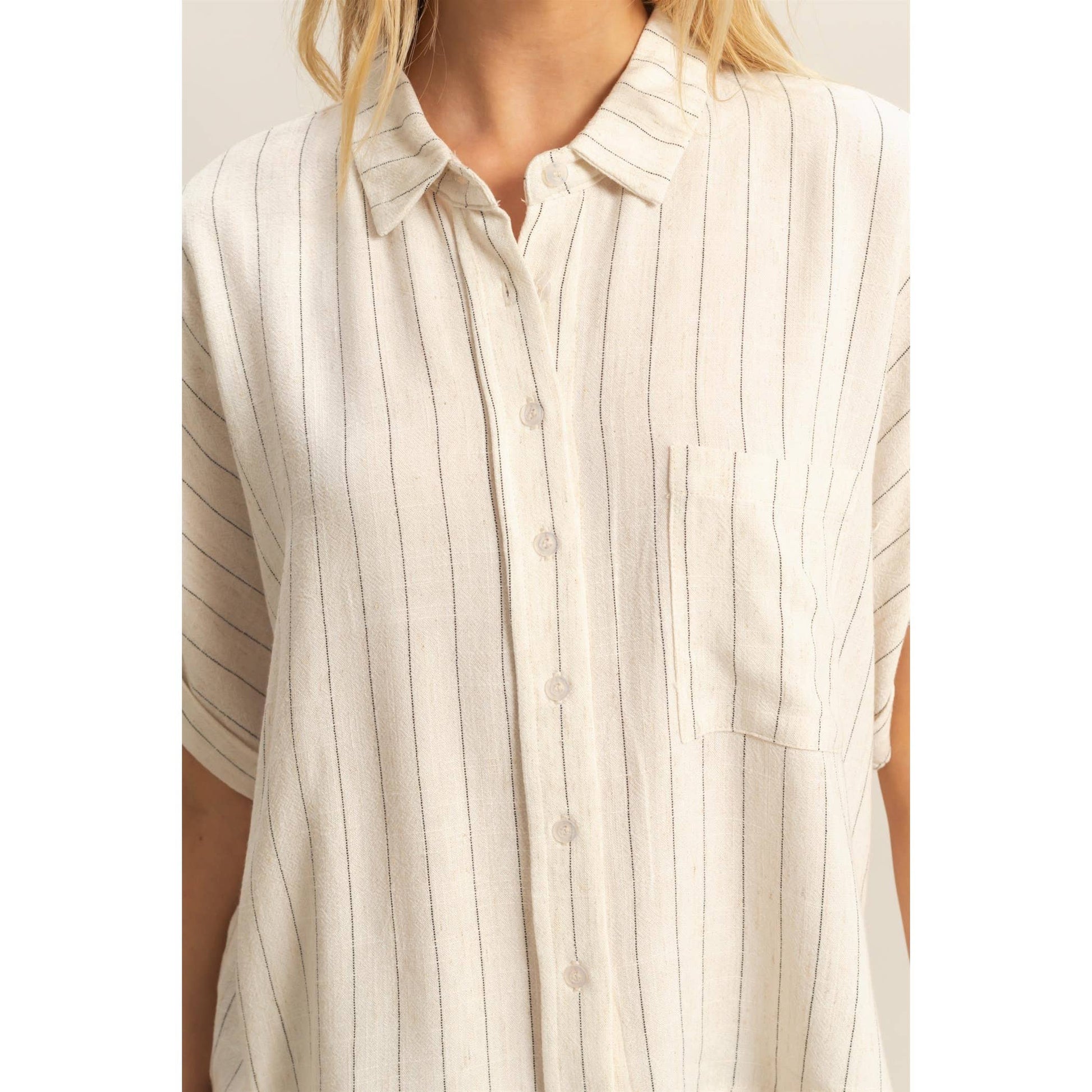 You'll be ready to hit the streets in this trendy shirt. Featuring a striped pattern, it features a collared neckline with short sleeves and a button-front placket. The shirt has a slightly oversized fit and a single chest pocket.
