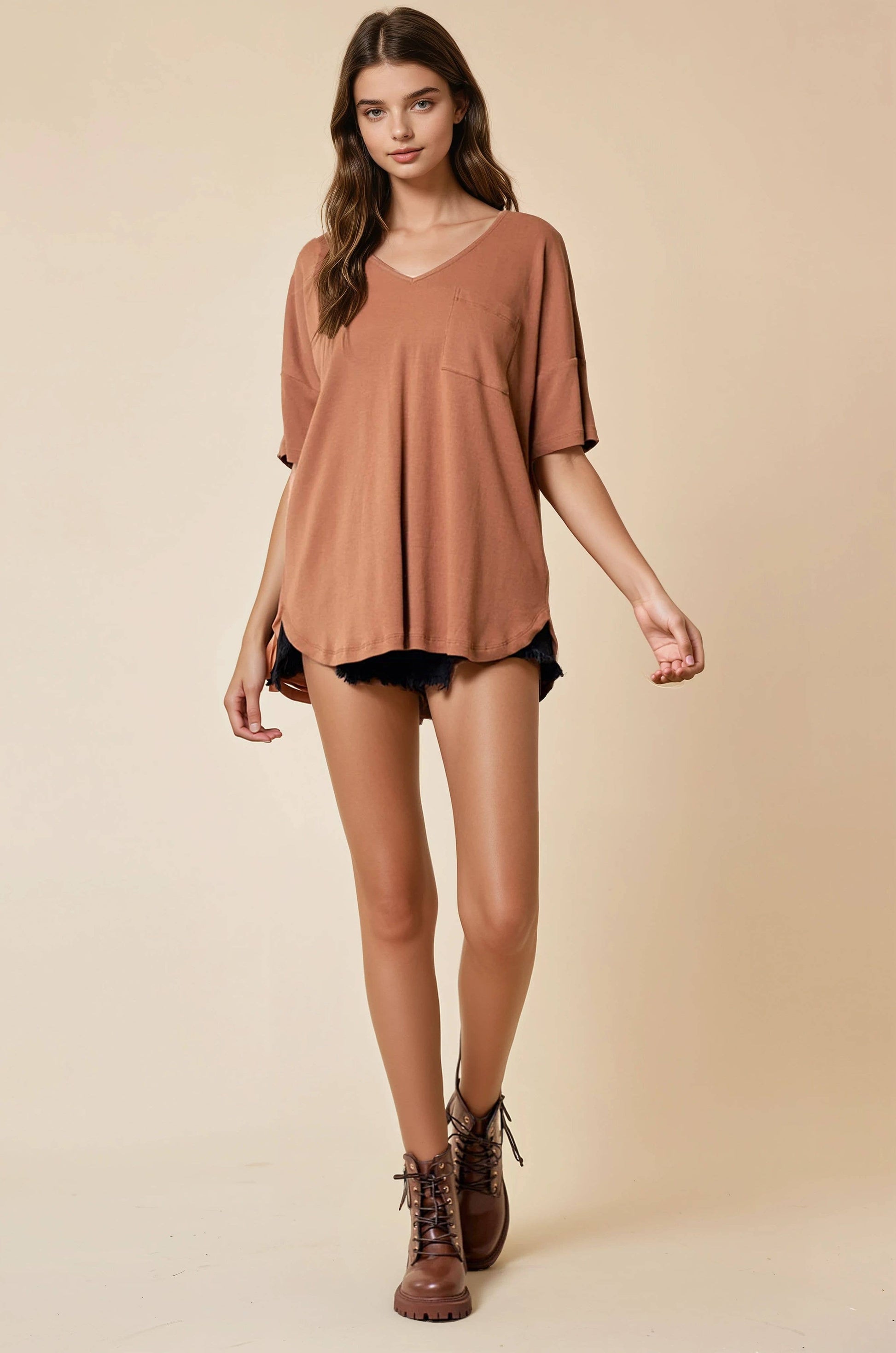 OVERSIZED V-NECK KNIT TOP Caramel