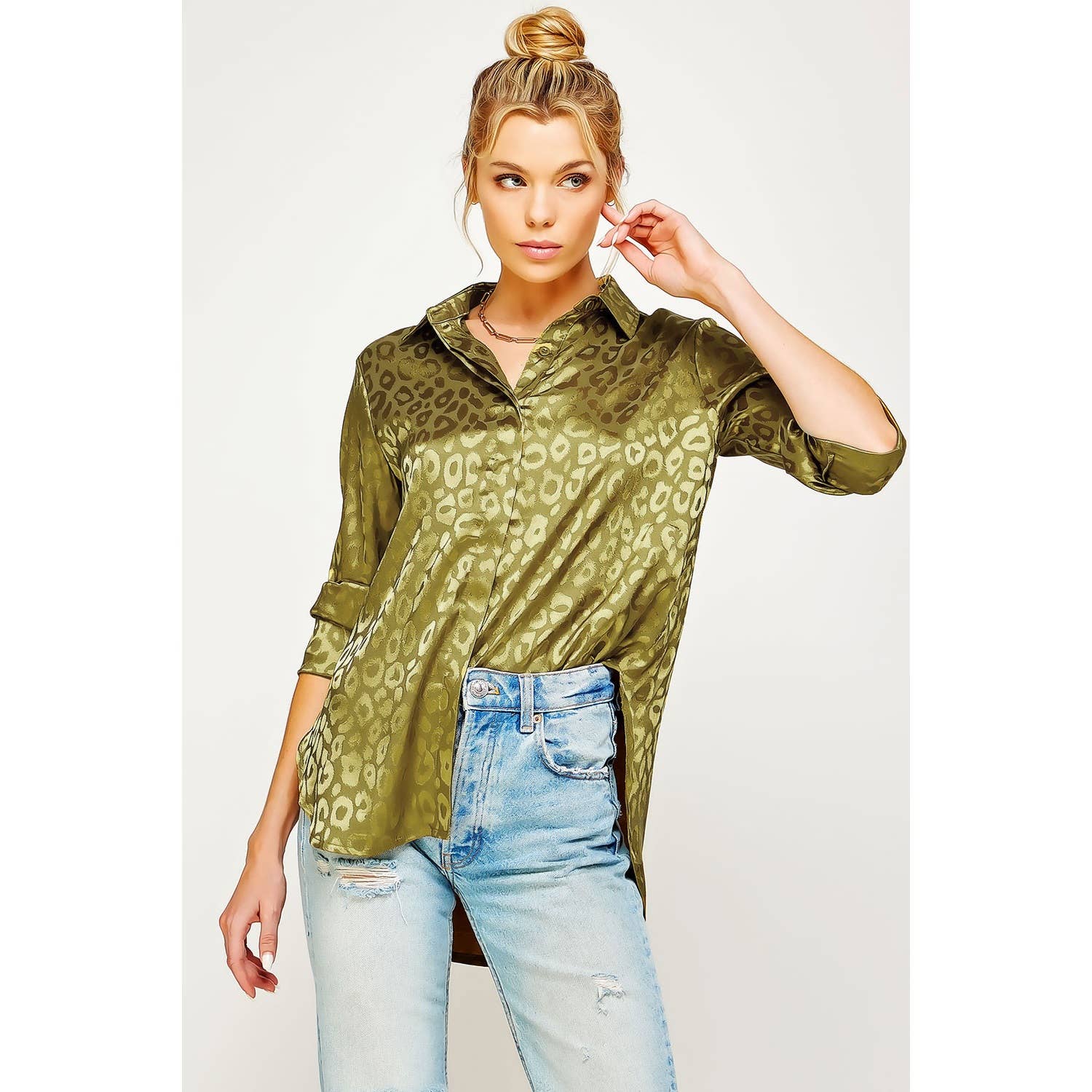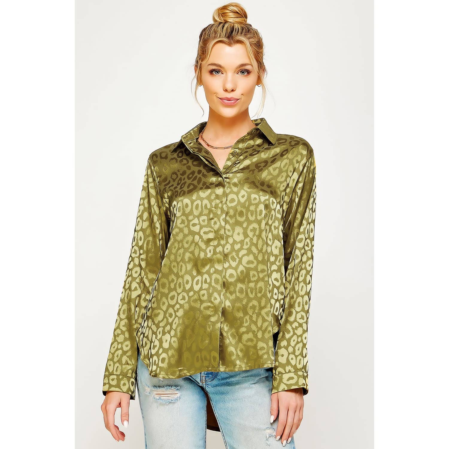 SATIN LEOPARD PRINT BUTTON DOWN TOP