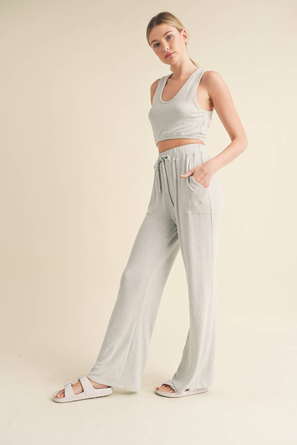 Soft-brushed Hacci knit tank and wide leg pants. Pants come with side pockets and adjustable drawstrings. Top has low V neck.