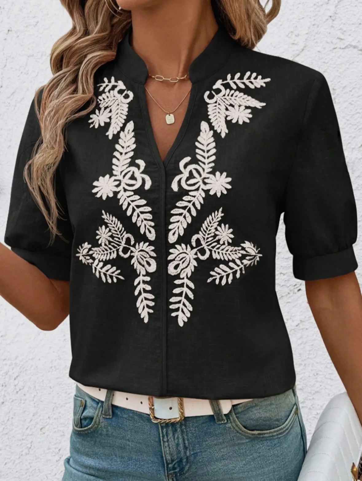 "Expertly crafted with linen-like material, this Vneck black top boasts elegant white embroidery for a touch of sophistication. Perfect for any occasion, this top offers both comfort and style in one versatile piece."